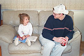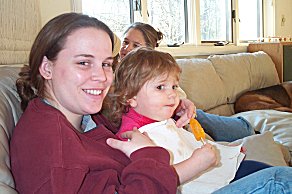 | Jordan greedily eyes Becky's breakfast- she's working the old "read to me now" dodge so she can steal something from Becky's plate! | ![]() |