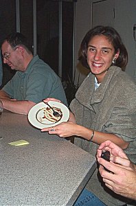 | Monika proves there's always room for apple crisp- we tried to get her to lick the plate clean, but she only does that at home games... | |