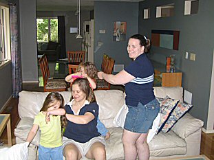 | Way too much estrogen that weekend- here's the girls doing one-another's hair... |