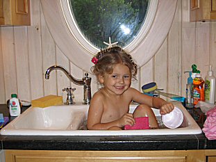 Taylor scraped a knee and needed to soak it. Best place was in the kitchen sink (we hadn't done that in a while...!) |