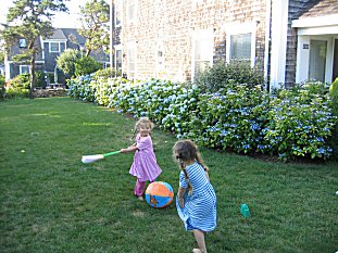 | Playing some broomball on the lawn. |