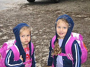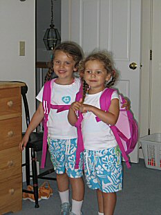 | Two girls, ready for their first day at camp. |