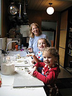 | Grandmother and 2 grandaughters building cookies. |