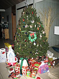 [ed- around 4AM, George heard some noises by the tree and went out to find 2 girls scurrying around. He sent them back to bed until 6 HERE's our tree, post santa and before the young ladies have attacked it. |