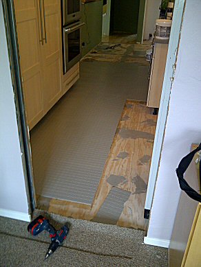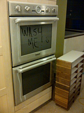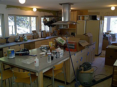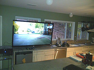 When we had the maple floors finished, we had to get the TV out of the family room... so we stuffed it into the kitchen. i bet i was the only kid on the block with a 70" TV in his kitchen :-) |