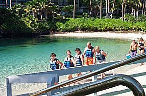 As soon as MJ learned she could get in the water with Dolphins, she was psyched! Bad news is, everyone wants to do it and spaces are limited, so you have to get into the daily lottery... or you can just show up and try to snarf a stand-by slot. We showed up Monday morning and 9AM and just got lucky! So, here's MJ lining up for Dolphin Quest...! |