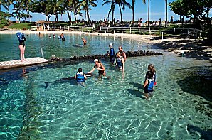 The real "hands-on" activity happens in this pen off to the left. They bring a half-dozen folks in at a time and people get to touch and hold the dolphins. The dolphins love it 'cuz they get fish-food snacks...! |