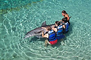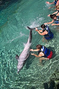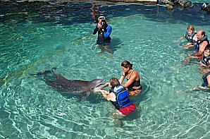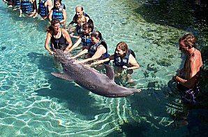 | First they get the group used to the dolphin- he comes up and lets everyone pet him... | |