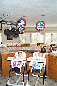 | Wow! It's been a whole year since the twins were hatched and that means it's time for... a BIRTHDAY PARTY! First step- trick out the high chairs with party balloons... | ![]() |