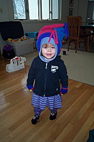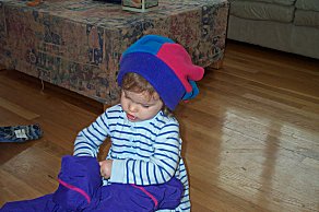| Here's Taylor with the prerequisite 4 layers of protection (before the snow suit). The way-cool hat was built by George's sister Sharon many moons ago; the kids love it! | ![]() |
