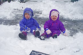 | At this age, the girls imitate everything, so we figured they should learn how to shovel snow early ;-) Here's Jordan getting acquainted with the shovel (she actually did this on her own...) | ![]() |