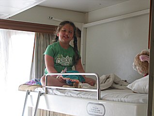 | Jordan (and bunny) in their bunk. When not in use, this folds up into the wall. |