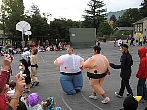 There were several of these "sumo" wrestler costumes. hard to get used to these kids swiveling their heads around to look backwards... seems like they should all be named "chuckie" |