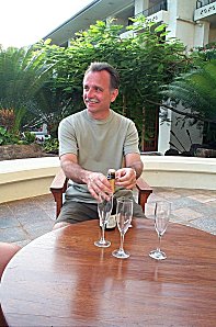 We saved the champagne from our wedding to share later on. Here's Joe opening it up over at the Hyatt... what a terrific resort..! |