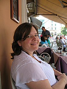 The city of Como sits at the southern end of Lake Como. It's fairly close to the Swiss border. We took the train up to check it out. HERE's MJ waiting for our boat at a little coffe bar. |