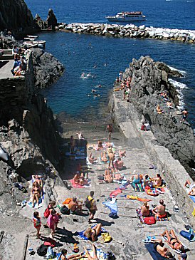 The town beach. Not much in the way of sand, but there's a ladder on the right to climb out; a diving "station" left; and some room for sunbathing. |