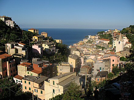Town #1- Riomaggiore This shot taken from our hotel balcony. And, yes, the town extends all the way down the hill to the water. And, yes, we schlepped our bags all the way up the hill... |