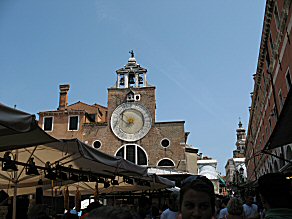 We chose to walk out to the far end, then take the water taxi back. The city was jammed shoulder-to-shoulder with tourists (July + Sunday + 3 cruise ships = what were we thinking??) WE went thru the market and caught this neat clock. |