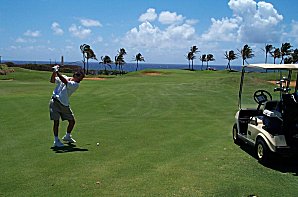 Kauai Lagoons- the Kiele Course Probably the prettiest course we've ever played! This is number 14, an interesting par 3. Our group donated 4 balls to Pele on this hole. Click for enlargement |