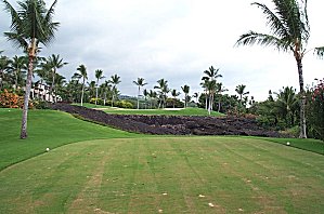 Another pretty hold- par 3, 17th. You hit over this old lava flow up to a very tight green. (also beware of the condos on the left- when we came by, one of the residents was video-taping everyone, probably to prove who hit a shot that broke a window or something...!) |