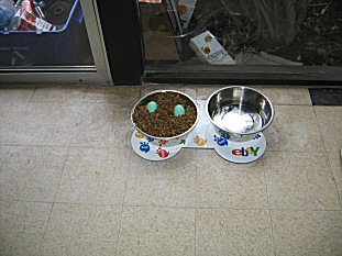 | Since it was pretty damp outside, we did the hunt in the house. Scooby didn't know what to do with the eggs in his bowl. |