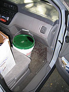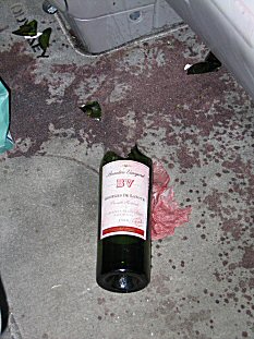 | HERE's a good reason to pay attention while driving. JT gave use a case of wine and a very special bottle. George was stopped in traffic and admiring the bottle. Traffic started to move and George had to stop short- here's the result... [ed- the car smells great now!} |