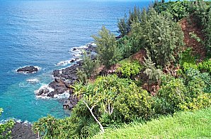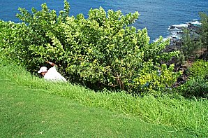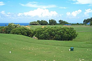 For our last round of golf, we took a ride up to Princeville. We had already given up on the concept of playing "The Prince", which is the toughest course in Hawaii. Instead, we played the Makai course, all 27 holes of it. Here's a nice, easy par 3 that you'd better hit the green or life gets miserable... ;-) |