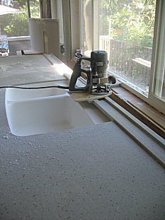 Sinks get seamed to the underside of the sheet; then we flip it over, drill a pilot hole and push in a guided router bit to cut the sink out. Then we put on the magic corian sink angle bit and it cuts a perfect edge for us! |