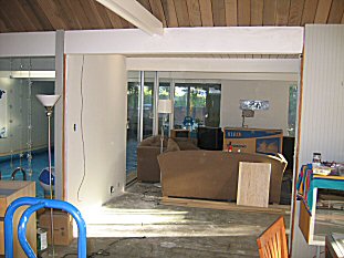 Plasterer also finished today- he did a terrific job in only 2 visits! HERE's a shot looking into the family room- he did the wall on the left and the fireplace (and George primed them at 5am today) |
