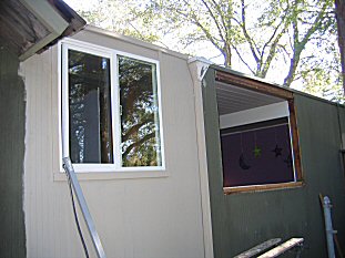 Then we reframed the window and insert a new, double-pane beauty- what a concept. HERE we've finished the bathroom window and we're doing their bedroom window. |