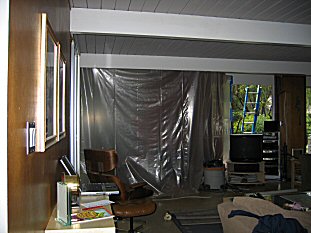 | Carving the fireplace was tres dusty, so George put up this temp screen that contained 97% of the mess. |