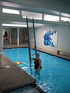 The conduit runs from the Family Room to the master closet- only way there is over the pool! Here's MJ demonstrating how we get access to work on it ;-) |