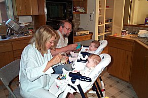 At the beginning of September, the kids took solid food 3 times a day, about 4 ounces per feeding. Whenever there are 2 adults around, we get to do a tandem feeding- here are Carol and George feeding the little ones. |