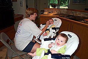| When they were 5-1/2 months old, we started the kids on solid food. This is an interesting exercise, since all they know how to do is suck; so they had to learn to chew and swallow. Also, we were still in the lovely corporate condo and we didn't have any high chairs, so they got fed in their bouncy chairs... | ![]() |