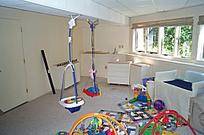 At the far end of the hallway is the playroom room. This is where MJ and the kids spend their days- there's plenty of room for the kids to play and crawl around. Also, we were able to hook the "johnny jump-ups" to the I-beam in the ceiling! |