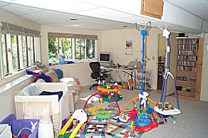 | Another shot of the playroom, looking back towards the door. Lots of windows on the left really light this room up. We set up MJ's office is at the far end of the room so she can do other stuff while watching the kids. | ![]() |