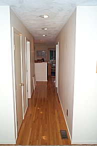 Then, if we head left down the hall, we'll run into the kitchen / family room. This picture is taken at the far wall of the family room, looking back into the kitchen. The central hallway and front door are to the left. |