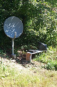 How to point a satellite dish. To make this a one-man job, you have to drag the receiver and TV into the front yard. Then you move the dish around until you find the satellite... easy! |