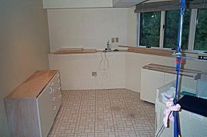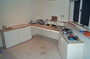 could learn to paint, etc... 8-) The previous owner had left some old cabinets in the attic and we use them. George installed them at the far end of the playroom and sandwiched together several sheets of plywood to form a large countertop. |