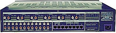| After lots of research, we settled on the Kustom 6640 amp. It takes 6 sources and powers 6 zones; the control panels are intelligent IR repeaters that listen for their own volume and source commands and pass all other signals through; and you can even hook up your doorbell to this system! (we found this one on ebay- dealer overstock...) |
