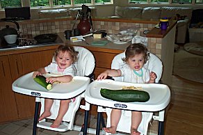 Of course, every gardener plants too many zucchinis... here's the little ones checking out some of the first zukes from the garden. |