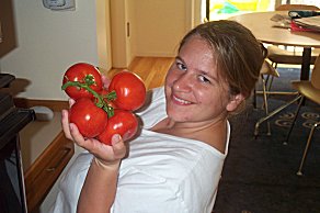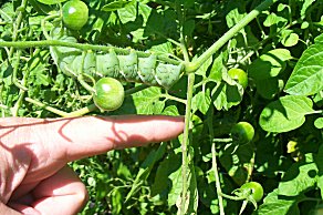 | Since we don't use pesticides, we always have a few pests. Here's a fine looking tomato hornworm that discovered our garden- he's been eating pretty well! | ![]() |