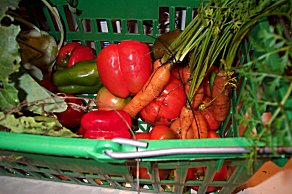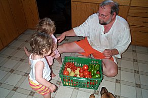 | Here's George with his helpers. The kids were fascinated with the market basket from the garden and always wanted to help. Today's haul included tomatoes, cukes, peppers and a couple of gourds. | ![]() |