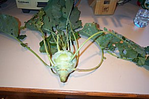 | We even got a kohlrabi..! This is a lot like a radish on steroids. It's kind of hard to judge the scale, but this is bigger than a tennis ball and smaller than a baseball... | ![]() |