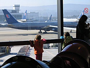 Leaving on a jet plane... We managed to get a direct flight from SFO to Orlando. The girls were pretty psyched about the whole thing- here they are, checking out our 767... |