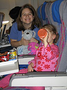 | The outbound flight was terrific- we all had small LCD tv viewers in the seat backs in front of us; and the girls got o watch the Disney channel from one coast to the other. Here's MJ, blue dog and Boo on the plane. |