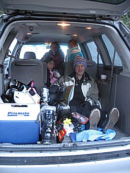 | HERE we are back at the car after the second day. Standard skiing mess back there! |