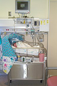 | Jordan's home in the Intermediate Care Nursery. The monitor up top watches her heart rate, respiration and the oxygen saturation in her blood. | ![]() |