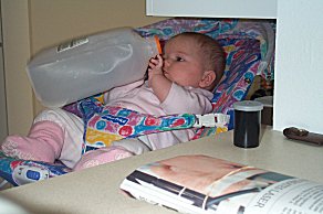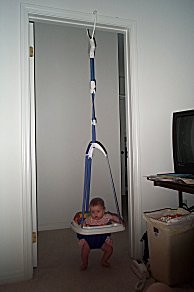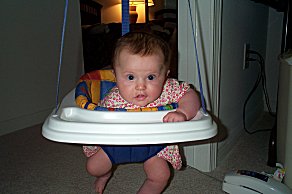 | Katie lent us a new baby toy- "Johnny Jump-Up". It looks like a medieval torture device, but it works like a champ- you adjust it so the kids feet just touch the floor | ![]() |