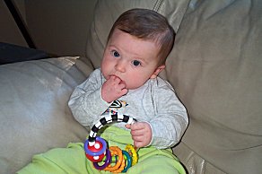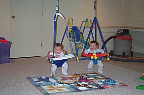 | Here they are in tandem jumpy chairs. These are teriffic- the kids will entertain themselves for 1/2 - 3/4 of an hour in these things..! | ![]() |
